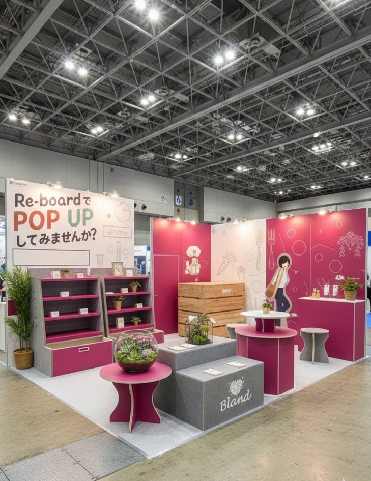 下野装飾では、Eco資材「Re-board(リボード)」を活用し、軽量・高強度・環境配慮を兼ね備えたブース装飾をご提案しています。